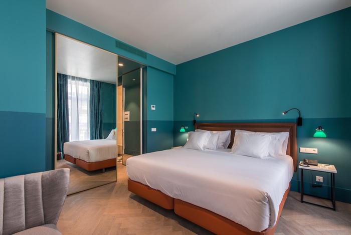 Chambres extérieures calmes qui grâce à leur surface de 25 m2 offrent un confort maximal. Elles sont équipées d'un grand lit ou de 2 lits twin, matelas de 32 cm de dernière génération et Top Nimbos, douche effet pluie, coffre-fort, minibar, Wi-Fi, smart TV, fer à repasser, machine Nespresso et bouilloire.
