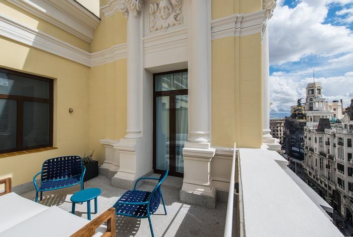 Elles se caractérisent par leurs magnifiques terrasses plein sud surplombant la Gran Vía de Madrid où vous pourrez prendre votre petit-déjeuner ou dîner en privé ou simplement profiter du soleil. Un caprice d'environ 25 m2 pour les clients qui recherchent une expérience unique de Junior Suite. Divisées en deux ambiances séparées, elles disposent de grand lit, baignoire, coffre-fort, minibar, Wi-Fi, smart TV, fer à repasser, cafetière Nespresso et bouilloire.