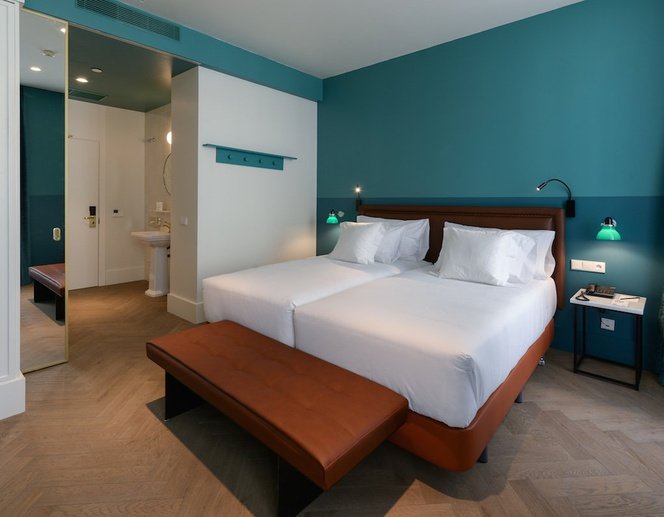 Las habitaciones dobles tienen una decoración exquisita uniendo a la perfección la tecnología más moderna con guiños al pasado. Siendo todas ellas interiores y situadas en las últimas plantas del Hotel, garantizan un sueño ininterrumpido y un descanso perfecto para el viajero más agotado. De una superficie de unos 20m2, disponen de 1 cama doble o 2 twins, colchones de 32cm de última generación y Top Nimbos, ducha de tipo lluvia, caja fuerte, minibar, Wifi, Smart TV.